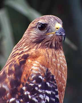 Red-shouldered Hawk, captive animal; While participating in the annual Earth Day Festival at the Enachanted Forest, I noticed the Avian Reconditioning Center display just a few yards from my Titusville Environmental Commission display. There is somewhat of a controversy concerning the photography of captive animals. This mostly occurs when a photographer tries to pass off a photo of a captive animal as shot in the wild, to a prospective client. While many publications have no problem using photos of captive animals to illustrate a point, that is an editorial decision on their part based on the content of the story. The photographer has a moral obligation to communicate to any prospective client whether a wildlife photo is wild shot or captive, and the failure to do so can tarnish the reputation of the photographer in the eyes of many publishers. Return to Gallery |