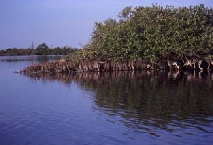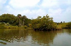 Eddy CreekThe Eddy Creek area was formed several thousand years ago when an inlet connected the Mosquito Lagoon to the Atlantic Ocean. Tidal currents through this inlet brought vast amounts of sand and sediment through the inlet into the lagoon forming a tidal delta that later became mangrove wetlands. The inlet later closed, leaving these wetlands. Here you will find yourself paddling along mangrove shorelines on shallow seagrass flats. Wading birds, pelicans, ospreys, and many other bird and wildlife species can be sighted from the seat of a canoe or kayak. To get to Eddy Creek, Drive from Titusville on the Max Brewer Causeway east across the Indian River Lagoon, past the refuge visitor's center until you come to the stoplight. Go straight through the stoplight, pay the $5 fee at the seashore entrance, and follow the road as it winds through the wetlands until it turns to the north. There is also a turn to the South, however it is off limits to the public due to it's proxomity of to the Space Shuttle Launch pads. Heading north, you are now at Playalinda Beach and will now begin to see the numbered beach access points to your right. Eddy Creek is the only turnoff to the left and is number 8. Here you find a parking area, boat ramp and a dock. Unfortunately, as of this writing Eddy Creek was closed due to post September 11th security measures. Hopefully this will change soon. Below is a link detailing closure. Wanna see an Aerial shot?