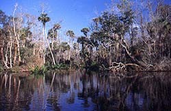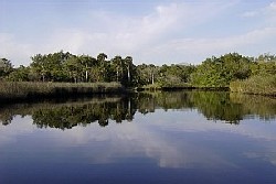 Turnbull Creek can be found just North of the Brevard County line in Volusia County on US-1 between Scottsmoore and the Town of Oak Hill. Heading south on US-1 you will pass the merge between SR-3 and US-1, then cross a bridge over a railroad track. Just south of the bridge the highway crosses Turnbull Creek on a level bridge. It is fairly easy to miss until you're right on top of it, so slow down real soon after the railroad bridge. Here is where you put in. From the South, you will see the railroad bridge before you see the bridge over the creek soon after entering Volusia County. If you cross the raised bridge over the railroad tracks you have gone about half a mile to a mile too far. After putting in at the US 1 Bridge, you have two choices, into the swamp (North) or towards the Lagoon (South). Paddling to the north takes you from the beginnings of the salt marsh habitat near the bridge, and rapidly the vegetation changes to a more freshwater environment. There will be a point where the treeline seen across the marshgrasses merge across the creek, but there is an small opening to fit through. Then the scenery changes dramatically. You find yourself in a narrow creek and shaded by trees growing from the wetlands until the creek opens into a most beautiful pond, (pictured above). This can be a challenging paddle, against the current and sometimes blocked by logjams but can be well worth it. After the pond, the creek seems to flow into this pond from the left. Not quite sure where it goes from there, I guess I'm just gonna have to go back. Photo by Dean Richard Pettit