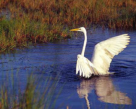 Great Egret on Merritt Island National Wildlife Refuge; One morning while shooting a group of egrets out on Black Point Wildlife Drive, this Great Egret suddenly decided to jump out into the middle of this small pool. Finding the water a little deeper than what he apparently expected, he hastily retreated back to the shoreline from where he came. Return to Gallery |